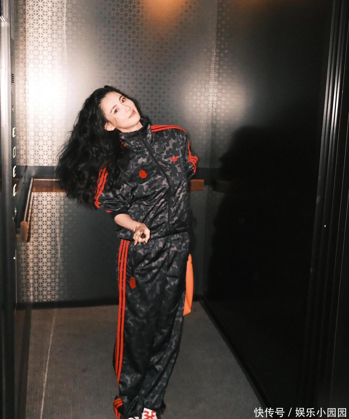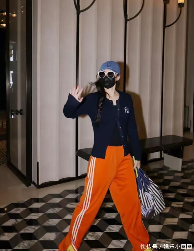 这件阿迪达斯橙色运动裤,穿在张柏芝身上,简直就像量身定做的一样,裤腿的开叉设计,超显腿长,搭配黑色修身针织衫,美出圈了。