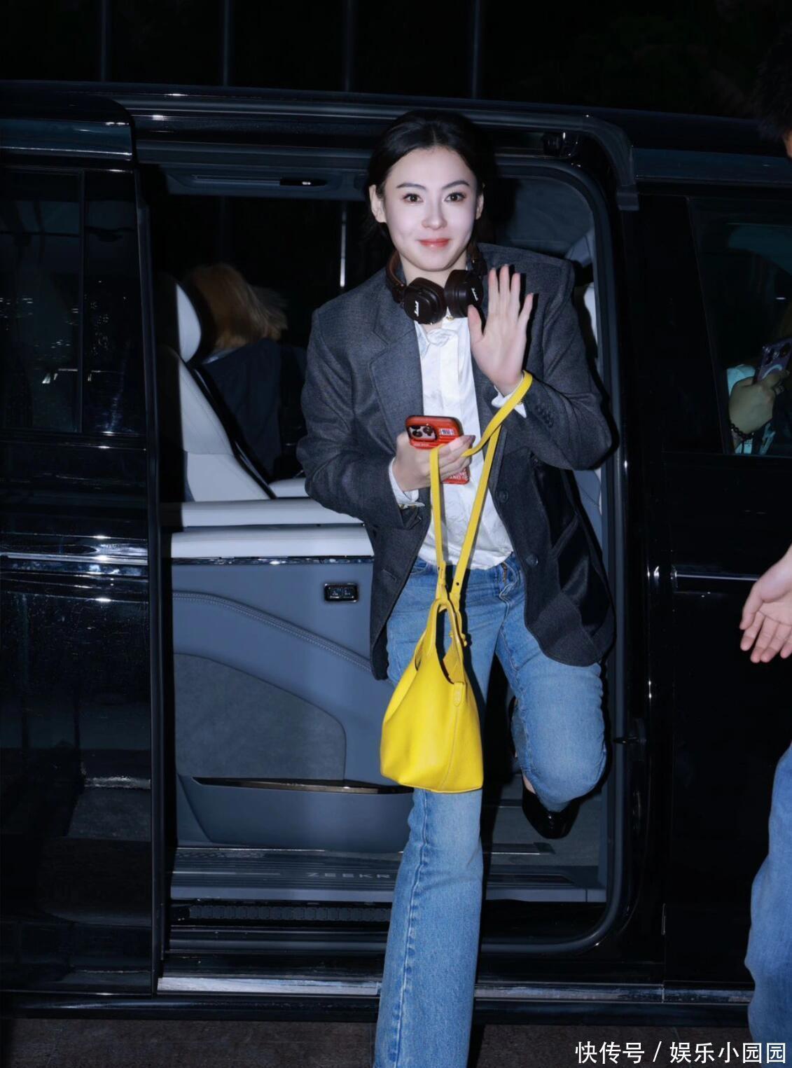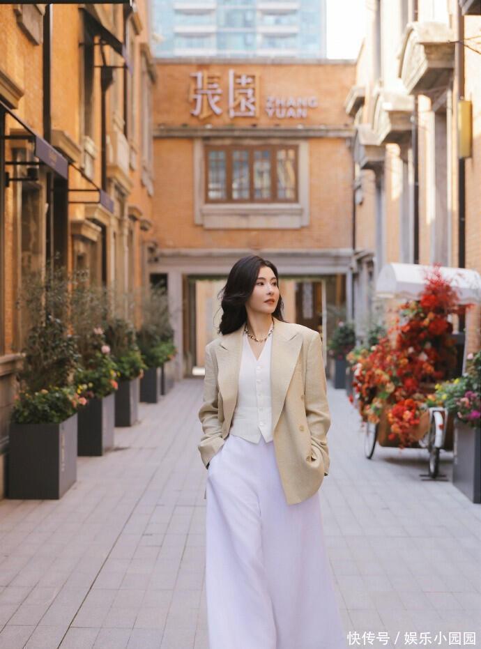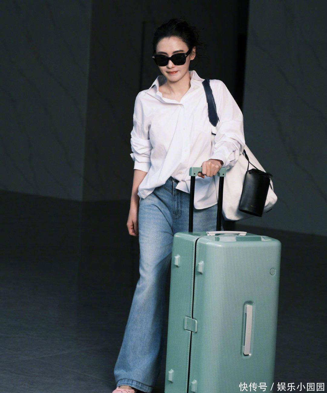 即便是简约款基础色的白衬衫和牛仔喇叭裤,张柏芝也能穿出秀场范儿,衣领敞开穿,袖子挽起来,美的不可方物。