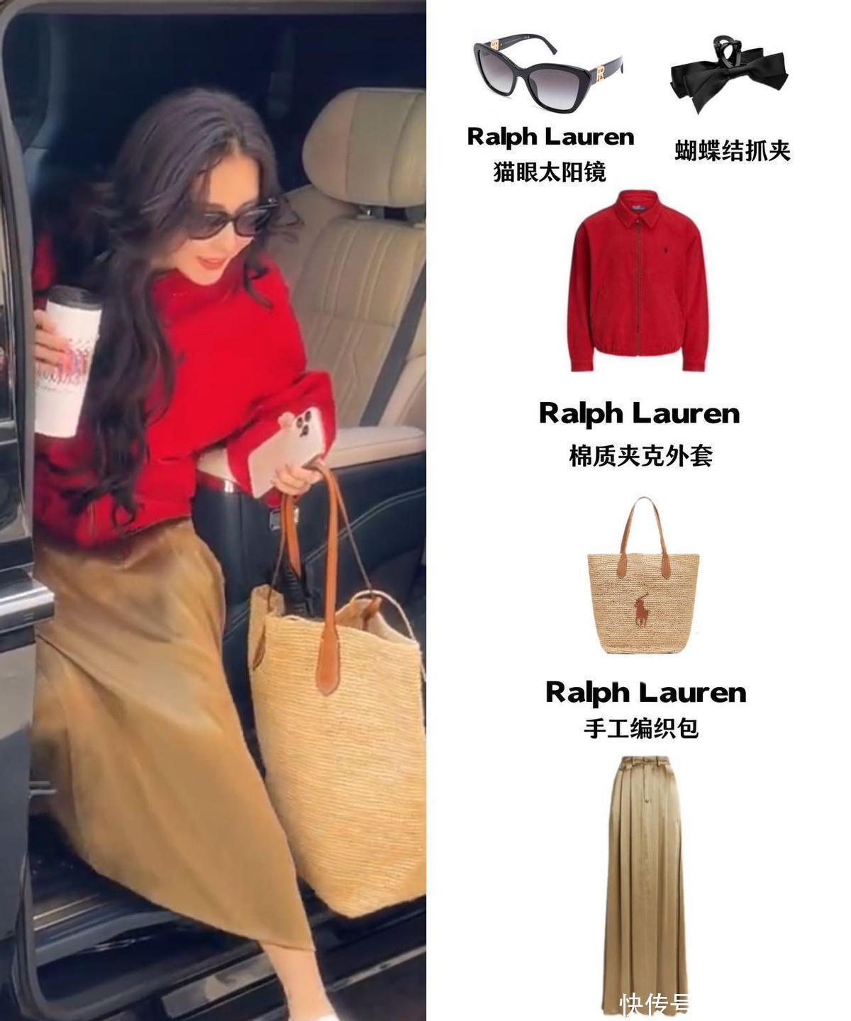张柏芝的穿搭,是属于不会撞衫的类型,这套红色的棉质夹克外套,搭配高腰A字长裙,拎款手工编织包,辨识度超高。