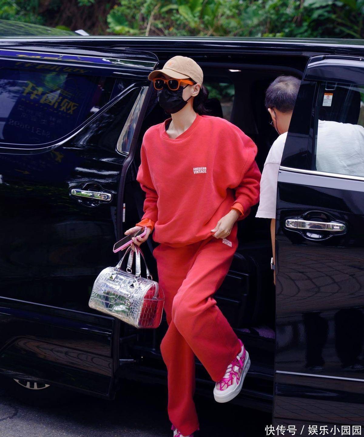 害怕出错可以直接选套装,张柏芝这套红色运动套装,就非常亮眼,而且衬肤又显白,版型宽松,舒适藏肉。