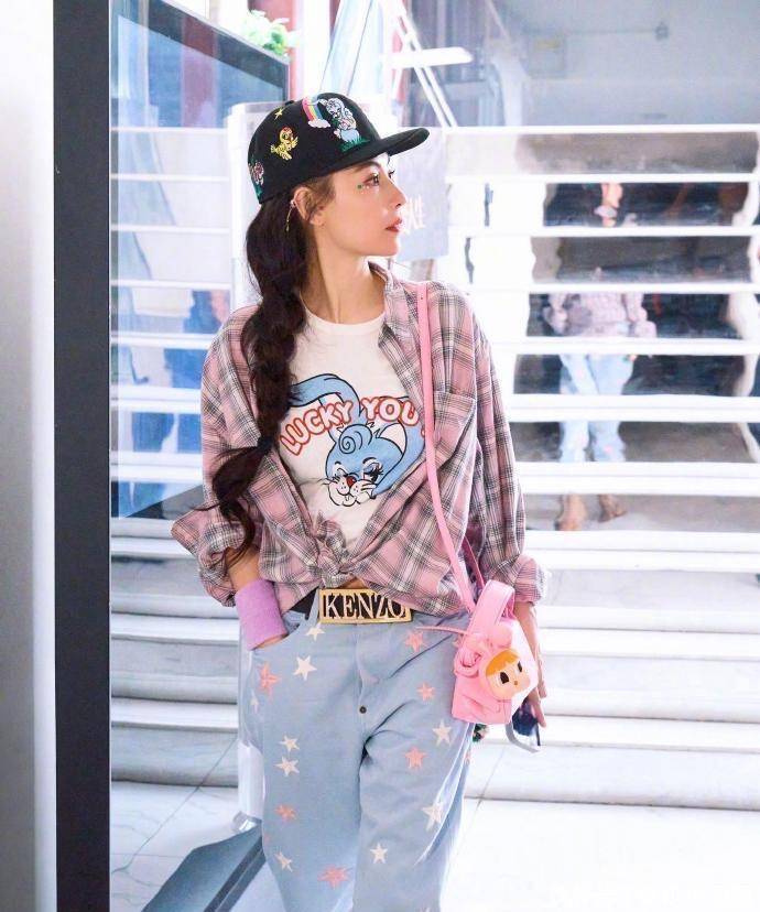 想要穿出少女感,就要学张柏芝这么穿,粉色格子衬衫配牛仔裤,加入卡通图案之后,佩戴上棒球帽显得特别俏皮。